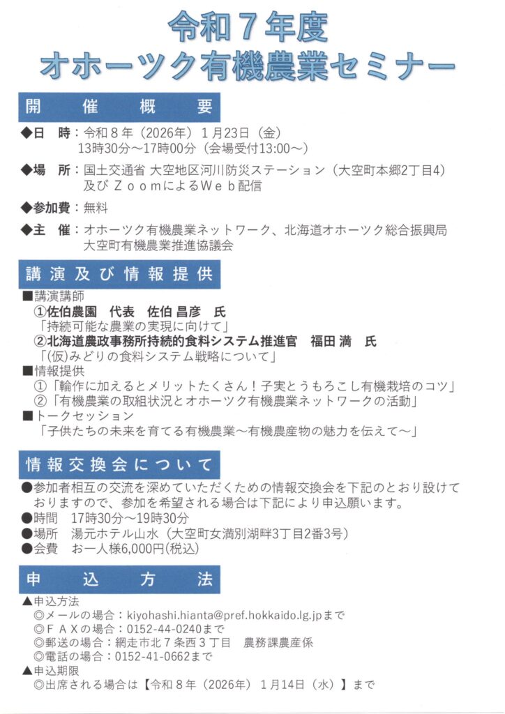 2026年1月22日 / 最終更新日時 : 2026年1月22日 shokunou_admin001 お知らせ 【1/23(金)大空町開催】令和7年度オホーツク有機農業セミナーのご案内 1月23日(金)、大空地区河川防災ステーションにて、「令和7年度オホーツク有機農業セミナー」を開催します。ご興味のある方はぜひご参加ください。 \ 最新情報をチェック / FacebookXBlueskyHatenaCopy